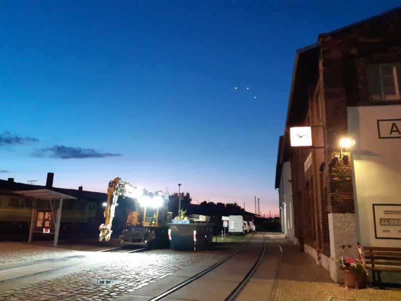 Nachdem die vergangenen Wochenenden der Erholung und dem Aufräumen nach dem erfolgreichen Sommerfest gewidmet waren, blickten die Aktiven an diesem Wochenende wieder nach vorne. Zunächst konnten wir beobachten, dass unser Museumsgelände als Logistikzentrum für die Bauarbeiten an den Bahnsteigen des Wittenberger Bahnhofs genutzt wurde. Hier wurden zur „blauen Stunde“ am späten Abend Baumaterialien auf Eisenbahnwagen verladen und mittels Zweiwegebagger zur Baustelle am Bahnhof gezogen.