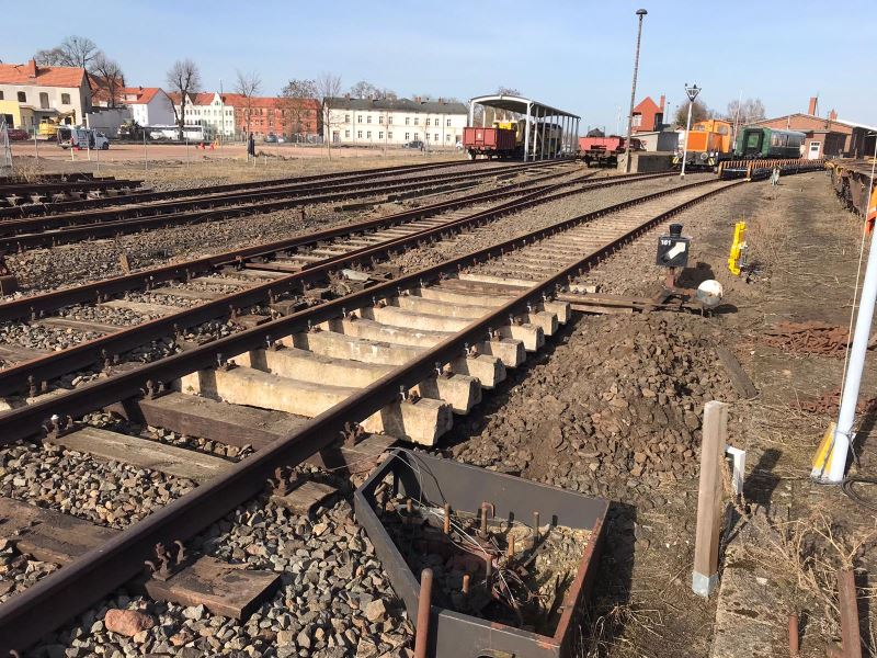 Und zu guter Letzt wurde auch an den Gleisen gearbeitet. So müssen wir regelmäßig marode Holzschwellen gegen gebrauchte aus Beton tauschen lassen. Da man für solche Arbeiten allerdings entsprechendes Gerät benötigt, haben wir die Arbeiten an eine zertifizierte Fachfirma vergeben. Auf dem folgenden Bild sieht man ein neues Schwellenfeld in der Nähe unserer Güterrampe.