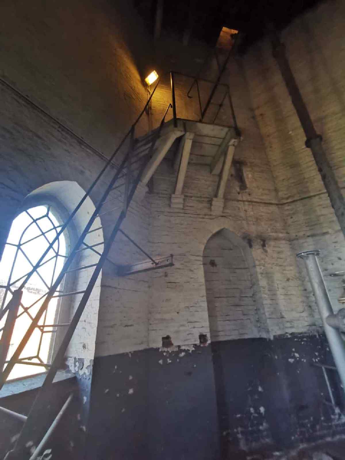 Mutige und schwindelfreie Mitarbeiter des Museums können über eine stählerne Leiter im Turm aufsteigen. Bitte versuchen Sie das aber aus Sicherheitsgründen nicht selbst, wenn Sie unser Museum das nächste Mal besuchen und die Tür des Turms offenstehen sollte.