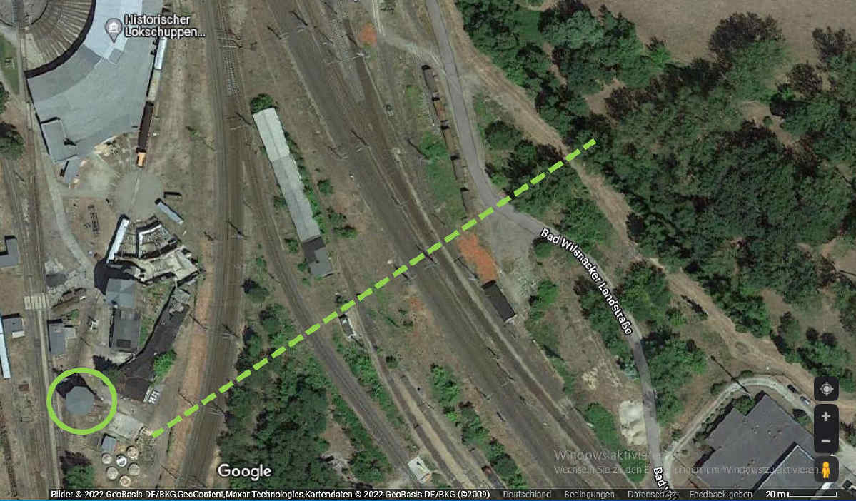 Auf dem folgenden Bild erkennen Sie den Verlauf des Kanals, angedeutet durch eine gestrichelte Linie (Bildquelle: Google Earth).
