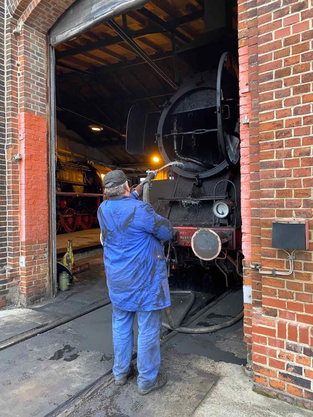 Was geschah an diesem Wochenende sonst noch? Nach Abschluss der Saison müssen unsere betriebsfähigen Fahrzeuge in den Winterschlaf versetzt werden. Am Samstag wurde deshalb der Kessel der 50 3570 ausgewaschen. Das bedeutet, dass die Rückstände, die beim Verdampfen des Wassers im Kessel zurückgeblieben sind, mit einem scharfen Wasserstrahl herausgewaschen werden.