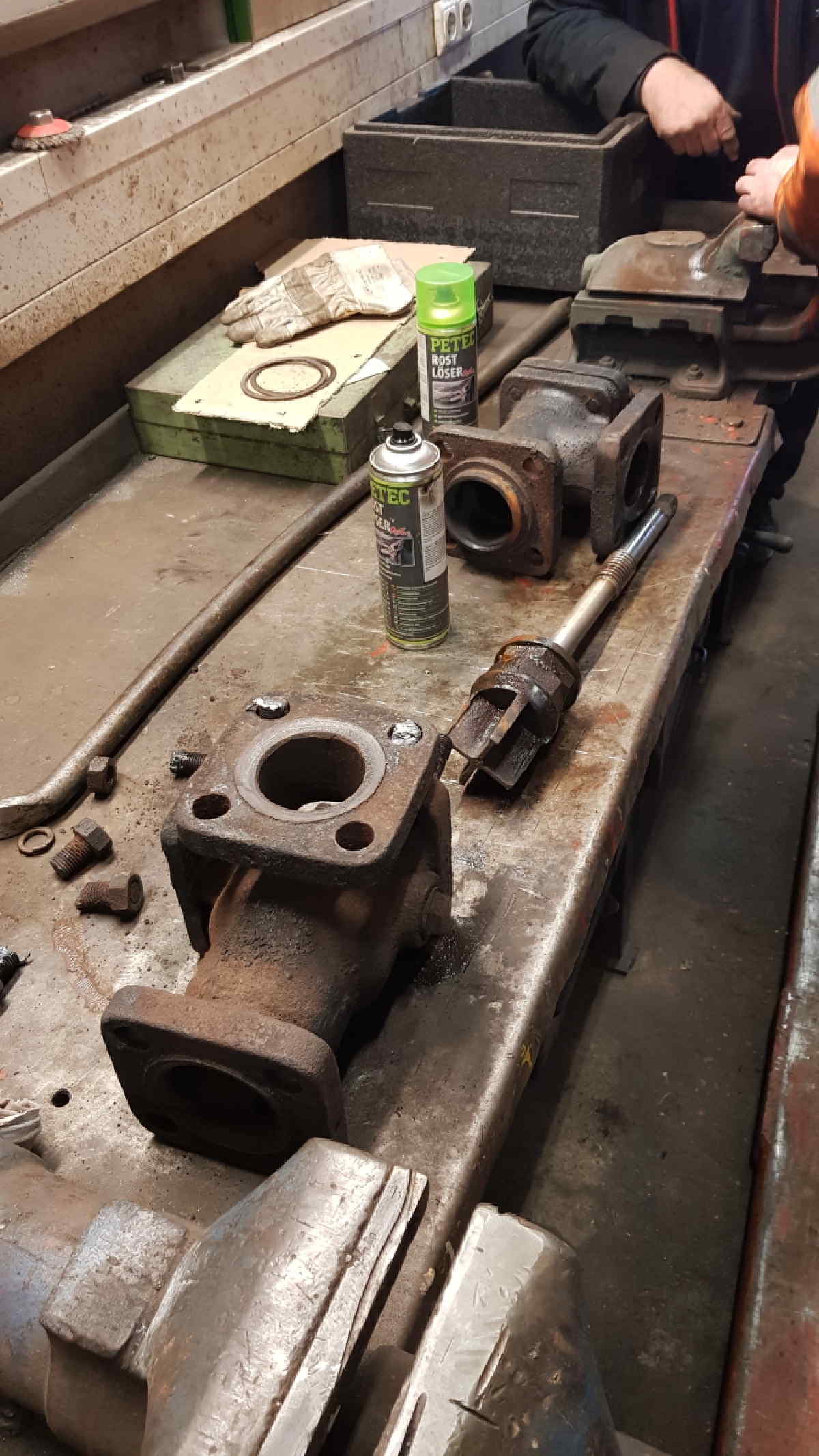 Beim letzten Aufdampfen der Dampflok 01 509 haben wir zudem festgestellt, dass das Umstellventil für die Dampfheizung an unser Dampflok 50 3570 nicht mehr ordnungsgemäß arbeitete. Es dient dazu, den Dampf aus dem Kessel der Lokomotive entweder an das eine oder andere Ende der Lok zu leiten, um dort an die Heizleitung von Personenwagen angeschlossen zu werden. Unser Ventil ließ aber Dampf in beide Richtungen strömen und wir mussten nun die Ursache erforschen. Dazu wurde das Ventil ausgebaut und zerlegt. Zum Glück hatten nur Kalkablagerungen an den Dichtflächen zu der Störung geführt.