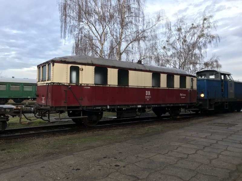 Das Museum Historischer Lokschuppen Wittenberge ist um eine Attraktion reicher. In der Nacht zum 17.12.2019 erreichte der Beiwagen 190 851-6 seinen neuen Standort in Wittenberge. Er blickt auf eine bewegte Geschichte zurück: Das Fahrzeug wurde 1927 bei der Firma Wegmann als 2-achsiger Dieseltriebwagen „VT 804“ gebaut. Die damalige Deutsche Reichsbahn Gesellschaft hatte insgesamt vier Stück dieses Typs erworben, um damit einen wirtschaftlicheren Betrieb auf Nebenbahnen zu testen. Zwei Stück davon verblieben nach dem Krieg in der sowjetischen Besatzungszone. 1951 wurde der Motor unseres Fahrzeugs entfernt und die Deutsche Reichsbahn der DDR setzte ihn fortan als Beiwagen unter der Nummer VB 140 602 ein, unter anderem auf der Strecke Rövershagen – Graal-Müritz. 1960 bis 1975 kam er auf der Prignitzer Kreisringbahn zum Einsatz, bis diese stillgelegt wurde. 1977 übernahm die Rbd Berlin den Wagen und diente dort fortan als Personal- und Bauzugwagen. 1988 übergab man ihn an das Deutsche Technikmuseum Berlin, wo er im Depot für Kommunaltechnik an der Monumentenstraße abgestellt wurde. Dort war er ab und zu für die Öffentlichkeit zugänglich, zuletzt im September 2019. Da die Abstellmöglichkeiten in der Monumentenhalle inzwischen ausgeschöpft sind und sich gerade ein Kontakt zwischen unseren beiden Museen entwickelte, ergab sich die Möglichkeit eines Transfers. Da offenbar auch das Konzept des Historischen Lokschuppens Wittenberge die Verantwortlichen des Technikmuseums überzeugte, wurde eine Übergabe vereinbart. Damit ist es gelungen, das vermutlich letzte existierende Fahrzeug der Perleberger Kreisringbahn und damit ein wertvolles Stück Prignitzer Eisenbahngeschichte in die Region zurückzuholen. Wir danken dem Technikmuseum sehr herzlich dafür! Danken möchten wir auch den Spezialisten der Eisenbahngesellschaft Potsdam, die uns den Wagen am 16./17.12.2019 von Berlin nach Wittenberge überführten. Die Aktiven des Historischen Lokschuppens Wittenberge werden den Wagen nun genauer untersuchen und ein Aufarbeitungskonzept erstellen. Wer uns dabei unterstützen möchte, finanziell oder tatkräftig, ist herzlich willkommen. Vielleicht gibt es auch noch jemanden, der Unterlagen über das Fahrzeug besitzt. Über Kopien oder Originale freuen wir uns sehr.