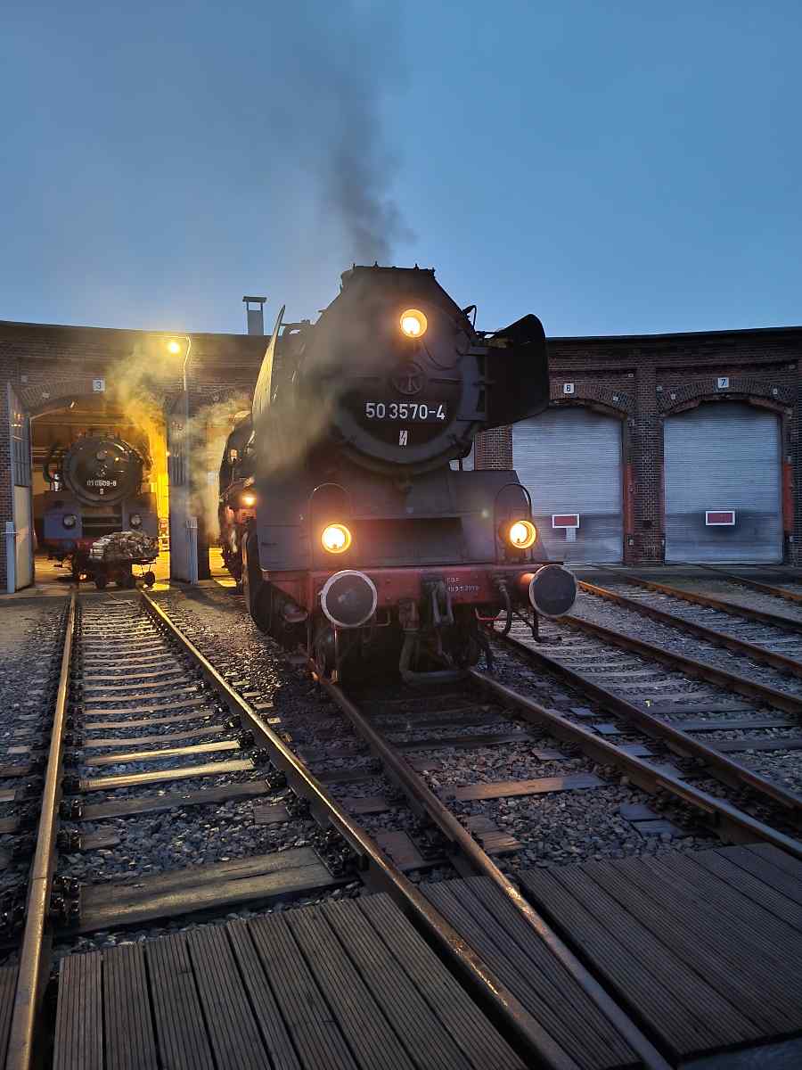 In der vergangenen Woche musste die Dampflok 01 509 angeheizt werden, weil sie am Samstag einen Sonderzug von Plauen nach Wernigerode bespannen sollte. Das ist, wie einige vielleicht wissen, nicht so ganz einfach. Um die ölgefeuerte Lok in Betrieb zu setzen bedarf es nämlich eines Dampfspenders, diesmal in Form unserer Dampflok 50 3570. So wurde am frühen Mittwochmorgen also zunächst die kohlegefeuerte Dampflok 50 3570 angeheizt.