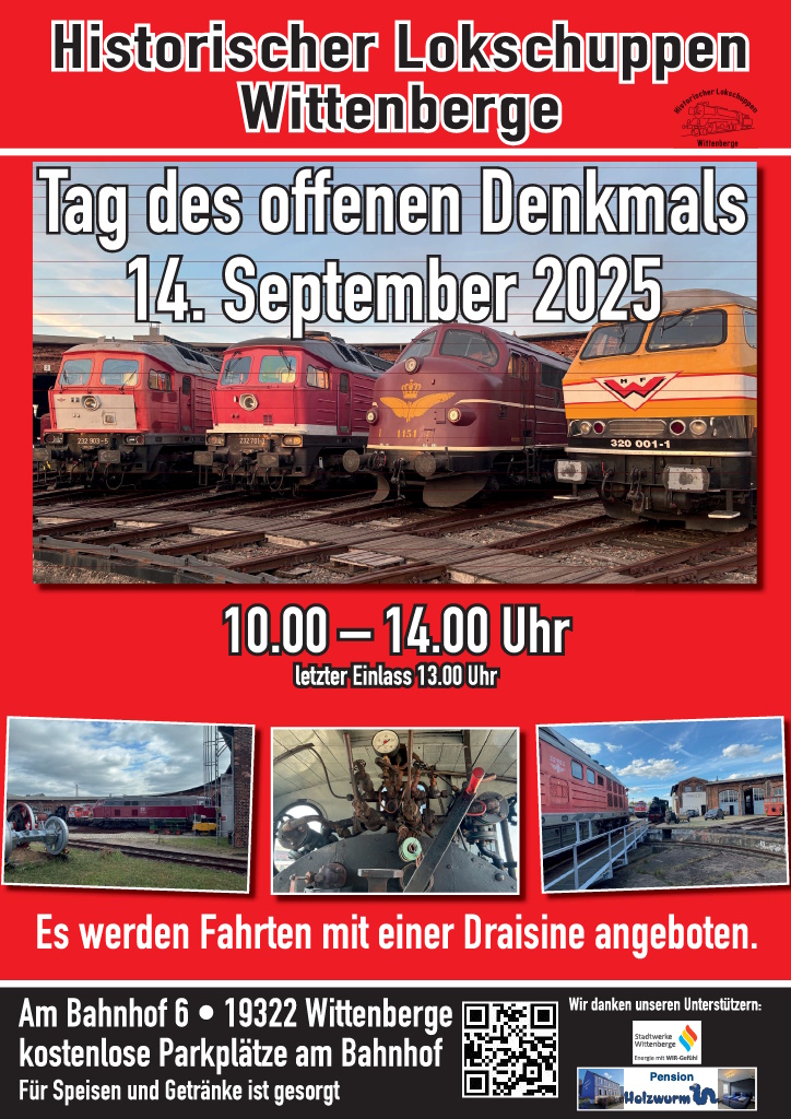 Wir freuen uns, Sie heute auf einige Veranstaltungen im September hinweisen zu dürfen. Der Tag des offenen Denkmals findet 2025 am Sonntag, 14. September, statt, und das Motto lautet: "Wert-voll: unbezahlbar oder unersetzlich". In Brandenburg werden wie in ganz Deutschland historische Gebäude und Anlagen für die Öffentlichkeit zugänglich gemacht. Wir schließen uns dieser Initiative gerne an und öffnen unser Museum außerplanmäßig auch an diesem Sonntag zwischen 10 und 14 Uhr. Das besondere an diesem Tag ist, dass der sonst übliche Eintrittspreis entfällt und Sie unser Museum kostenlos besuchen können. Wir freuen uns natürlich über Spenden, weil der Betrieb des Museums auch an diesem Tag Geld kostet. Eine Liste aller sonst in der Gegend geöffneten Denkmäler finden Sie auf der Internetseite der Deutschen Stiftung Denkmalschutz https://www.tag-des-offenen-denkmals.de/programm . Hier gibt es eine Suchfunktion. Wenn Sie unter der Rubrik "Programm" als Ort "Landkreis" und im Feld für den Ort "Prignitz" eingeben, finden Sie auch etliche andere interessante Orte, deren Besuch Sie gut mit einem Besuch bei uns kombinieren können. Am Samstag, den 20. September, wird zudem bundesweit der "Tag der Schiene" begangen, an dem viele Eisenbahnunternehmen und -museen ihre Arbeit vorstellen. So werden auch wir an diesem Tag zwischen 10 und 16 Uhr für Sie zur Verfügung stehen. Ab 17 Uhr findet ein Konzert im Lokschuppen statt, das Ihnen klassische Musik in Form von Werken von Händel, Haydn und Mozart kredenzt. Zum ersten Mal wird in diesem Rahmen die besondere Kulisse des Lokschuppens auch für einen Programmbeitrag der Ballettgruppe der Kreismusikschule genutzt. Konzerte wie dieses finden bereits seit ein paar Jahren im Rahmen der Veranstaltungsreihe Klanglandschaft Prignitz statt und hat bereits eine eigene Fangemeinde, weil die klassische Musik in Kombination mit unserer einmaligen Atmosphäre ihren ganz besonderen Reiz hat. Der Eintritt für das Konzert kostet 14 Euro, ermäßigt 9 Euro (Schüler, Studenten, Leistungsempfänger). Nähere Informationen finden Sie auch unter https://www.klanglandschaft-prignitz.de . Und wo wir schon über Termine sprechen: Am ersten Oktober-Wochenende findet unsere Veranstaltung Herbstdampf statt. Am 4. und 5. Oktober lassen wir wieder die Herzen aller großen und kleinen Eisenbahnfans höherschlagen, wenn unsere historischen Fahrzeuge wieder in Aktion zu sehen sind. Nähere Informationen wird es bald an dieser Stelle geben.
