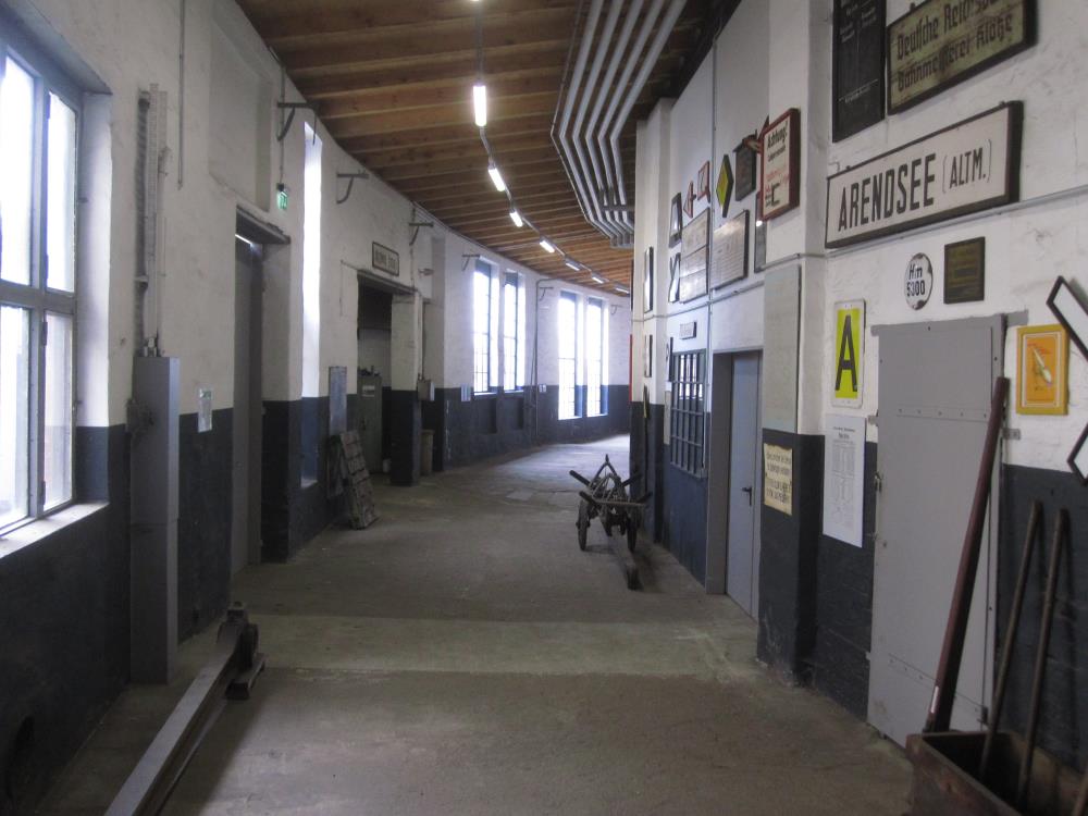 Von der Werkstatt auf dem Weg zur Fahrzeughalle gelangen unsere Besucher durch einen Gang, an deren Wänden wir verschieden Bahnutensilien angebracht haben. Hier sind verschiedene Signalmittel und Hinweisschilder zu erkennen, die früher für den Bahnbetrieb typisch waren.