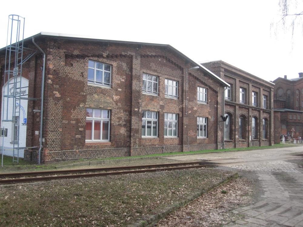 Ein Blick auf den Südgiebel des Museumsgebäudes des Lokschuppens 2. Darin sind Büros, Ausstellungsraum, Elektrowerkstatt und Tischlerei untergebracht. Das Obergeschoss ist vermietet. Früher diente dieser Gebäudeteil im Untergeschoss als Werkstatt. Im Obergeschoss waren Umkleideräume und Waschgelegenheiten für die Betriebsangehörigen eingerichtet.