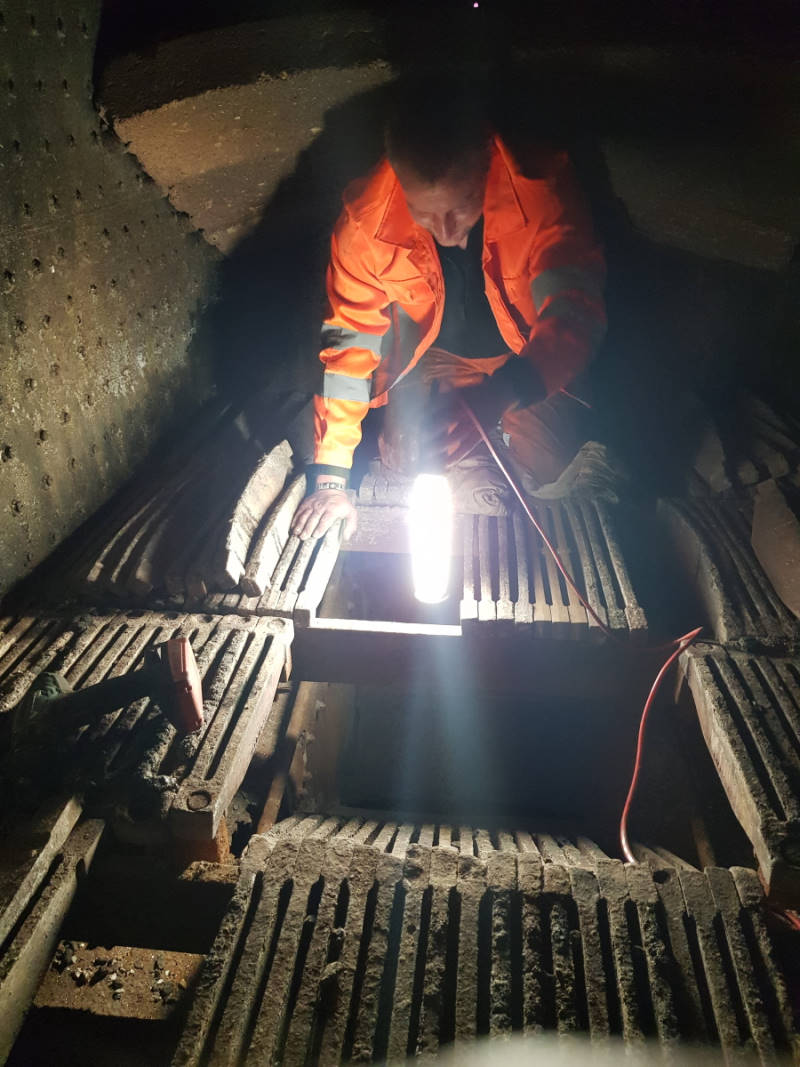 Im Inneren der Feuerkiste wurden die Roste kontrolliert, auf denen das Feuer brennt, wenn die Lokomotive angeheizt ist. Mit der Zeit zundern diese gusseisernen Roststäbe allerdings ab oder verbiegen aufgrund der thermischen Belastung. Sie müssen dann gegen neue ersetzt werden.