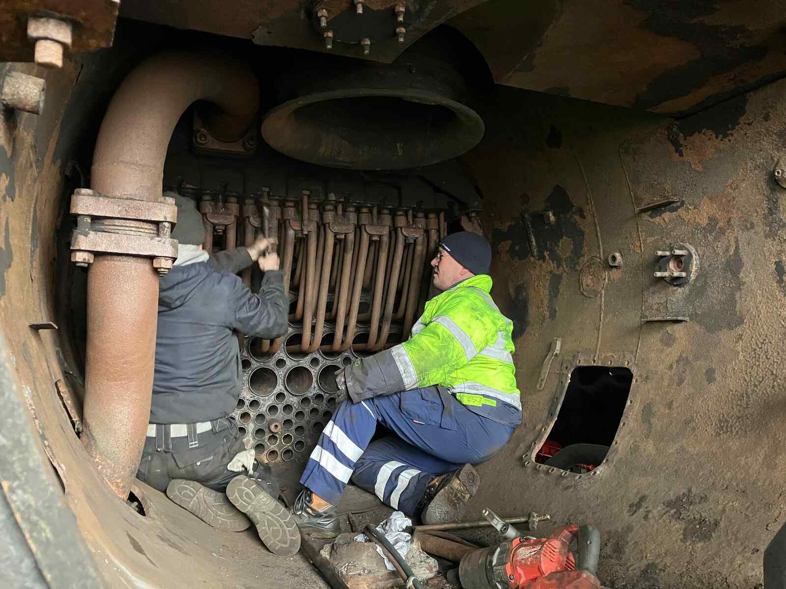 Zunächst ging es darum, unsere Dampflok 50 3570 zum Wechsel der diversen Rohre im Kessel vorzubereiten. Dazu mussten die sogenannten Überhitzerelemente ausgebaut werden. Dabei handelt es sich bei unserer Lok um 38 Rohrschlangen, in denen der Dampf vom Kessel noch einmal extra erhitzt wird, bevor er in die Zylinder der Lok eingespeist wird. Dadurch wird sein Wirkungsgrad erhöht.