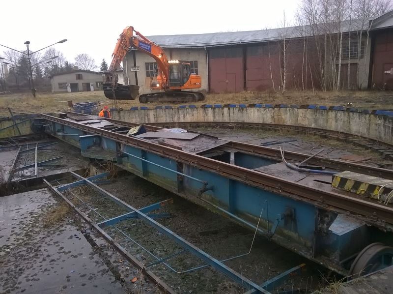 Wer die Verhältnisse im alten Bw Wittenberge kennt, weiß, dass es ehemals zwei Drehscheiben und noch einen weiteren Lokschuppen gab. Der Schuppen war als sogenannte Rotunde ausgebildet, also ehemals ein vollkommen geschlossenes Gebäude mit innen liegender Drehscheibe. Leider wurde das ganze bzw. die Reste davon Ende des letzten Jahrtausends abgerissen bzw. verschrottet. Nun, da man ja nie genug Platz in einem Museum haben kann, entstand vor einiger Zeit der Plan, doch mittelfristig an einen Wiederaufbau der Drehscheibe, Gleise und später Teilen des Gebäudes zu denken. Und manchmal geht es schneller als man denkt: So konnten wir kurzfristig die 20-Meter-Drehscheibe des ehemaligen Bahnbetriebswerkes Parchim erwerben, die noch relativ jung ist. Diese wurde in den letzten beiden Tagen demontiert und die Einzelteile nach Wittenberge verfrachtet. Als nächstes werden wir die Teile aufarbeiten, dann eine neue Grube erstellen. Unser Dank gilt allen Beteiligten für die schnelle und unkomplizierte Abwicklung. Die Fotos stammen von Dirk Endisch und entstanden am 12. und 13.1.2016.