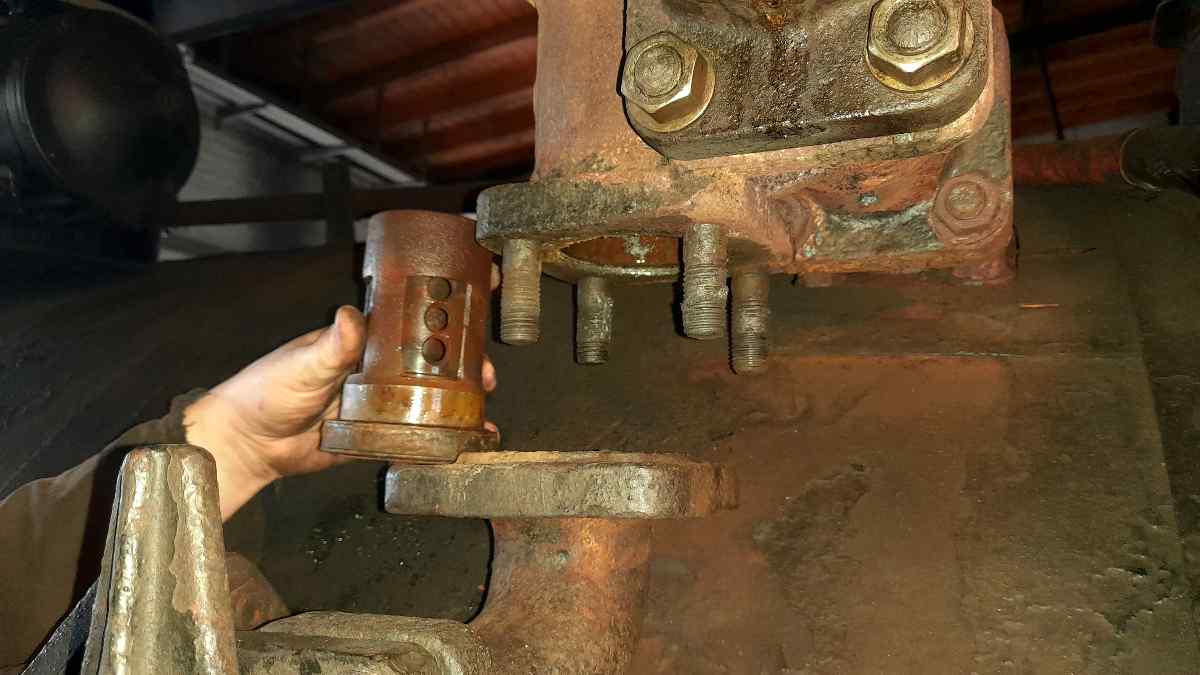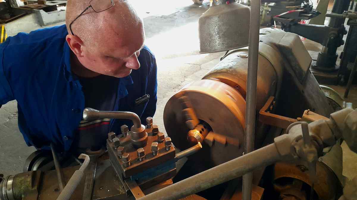 Bei 50 3570 wurden die Rückschlagventile ausgebaut. Sie dienen dazu, die Leitungen abzudichten, über die während des Betriebes frisches Wasser in den Kessel nachgespeist werden kann. Die Ventile bestehen aus zwei Teilen: Einerseits ein Gehäuse mit einer Dichtkante darin und andererseits der eigentliche Ventilkörper. Letzterer läuft am Ende kegelförmig zusammen und wird durch den Dampfdruck im Kessel gegen den Sitz im Gehäuse gepresst. Wird nun eine Pumpe angestellt, wird der Ventilkörper durch den Pumpendruck aus dem Sitz gehoben und Wasser kann durch den Spalt strömen. Die Teile sind aus Messing gefertigt, damit sie nicht rosten. Messing ist jedoch ein relativ weiches Metall. So kann es passieren, dass sich durch das Schließen des Ventils eine Furche im Ventilkörper bildet, wenn dieser wieder auf den Sitz gedrückt wird. Dadurch wird das Ventil im Laufe der Zeit undicht. Ventilkörper und –sitze müssen daher regelmäßig auf der Drehbank nachgearbeitet werden. Hier ein paar Bilder vom Ausbau und der Bearbeitung eines Ventils und ein Vergleich vor und nach der Bearbeitung.