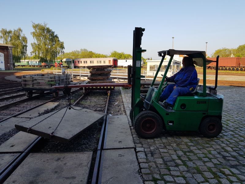 Aber auch außerhalb der Besuchssaison sind Vereinsmitglieder im Einsatz. So haben sie vor einigen Tagen im Gleis unter der Besandungsanlage an die 100 dort verbaute teils verrottete Holzschwellen gegen gebrauchte, aber gut erhaltene Betonschwellen austauschen müssen.